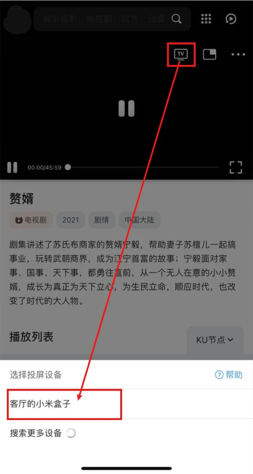 打开QQ浏览器(会接管网页播放器)->打开球圣短剧->播放视频->选中投屏图标->等待搜寻出智能电视/电视盒子->选中,即可投屏。