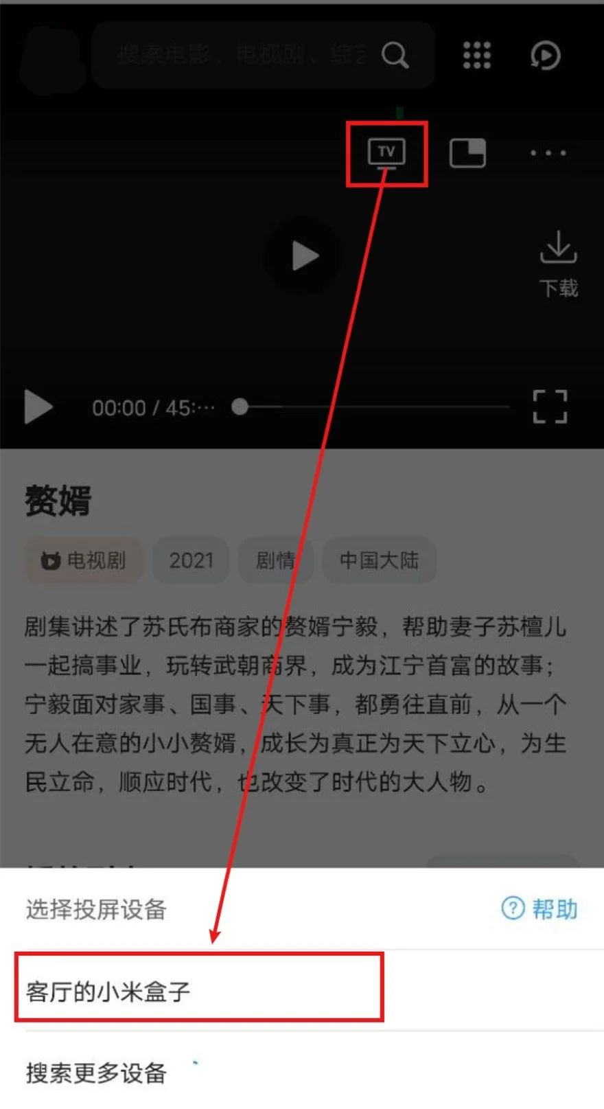 安卓夸克浏览器->打开球圣短剧->开始播放->全屏->左下角投屏->等待搜寻到智能电视/电视盒子->选中,即可投屏。